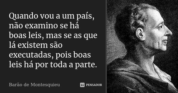 3. "Tudo estaria perdido, se o mesmo homem, ou o mesmo corpo de principais, ou de nobres, ou do povo, exercessem os mesmos três poderes: o de fazer as leis, o de executar as resoluções públicas, e o de julgar os crimes ou as divergências dos particulares." (MONTESQUIEU, Charles-Louis de Secondat. O espírito das leis. Tradução Célia Gambini).